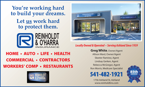 Reinholdt & OHarra Insurance in Ashland, Oregon is the longest locally owned and operated independent Ashland Insurance agency since 1939 providing the right protection for their clients homes, auto, business, life and health insurance. Reinholdt & OHarra will determine how much insurance coverage you will need, provide you with competitive pricing & flexible payment plans & provides personal assistance in case of a loss. Reinholt & OHarra works hard to build their clients trust & confidence in them. Reinholt & OHarra in owned by agent Greg White & Allison Ward, and the Tom Kennedy, Skeeter Ramirez are agents and Ron Morris is a Medicare Specialist.